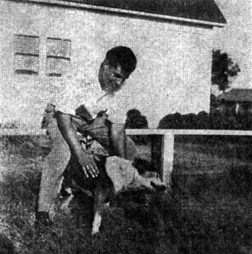 "Patches was a large, short-haired, black-and-white mongrel, half collie and half Walker fox-hound which had been given to Robert for Christmas 1917. 'Patch' was a puppy with his eyes barely open when Robert got him, but under the boy's care the animal throve. Boy and dog became inseparable. When Robert ate, the dog sat beside his chair. When Robert helped himself, before eating a bite, he helped Patch to food." (p. 74)