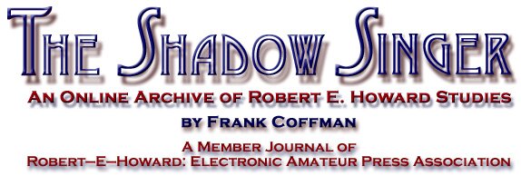 elcome to the inaugural issue of THE SHADOW SINGER, my contribution journal to Robert-E-Howard: Electronic Amateur Press Association. This issue is part of the first Official Posting of REHEAPA. My journal will feature essays, comments, reflections, and creative content with a centralizing focus upon the achievement of Robert Ervin Howard (1906-1936).